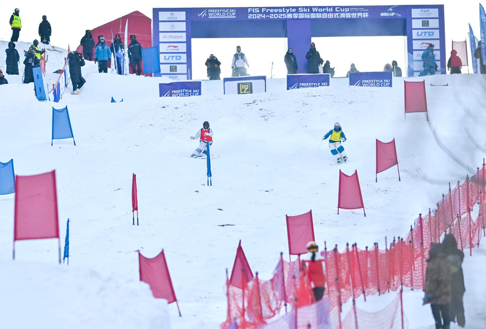 2月22日,2024-2025賽季國際雪聯(lián)自由式滑雪世界杯(北大湖站)雪上技巧女子雙人比賽在吉林市北大湖滑雪度假區(qū)舉行。新華社記者 顏麟蘊 攝