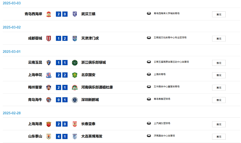 圖為2025賽季中超聯(lián)賽第二輪賽果。圖片來自中國足球職業(yè)聯(lián)賽聯(lián)合會官網
