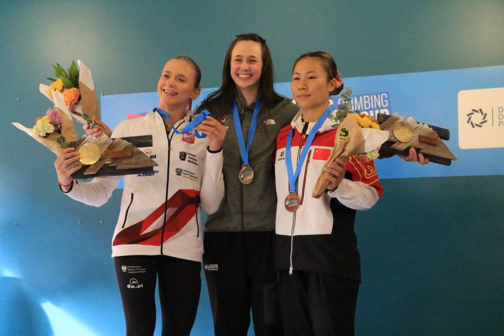 女子前三名在頒獎(jiǎng)儀式上,右一為鄧麗娟。中國國家攀巖隊(duì)供圖