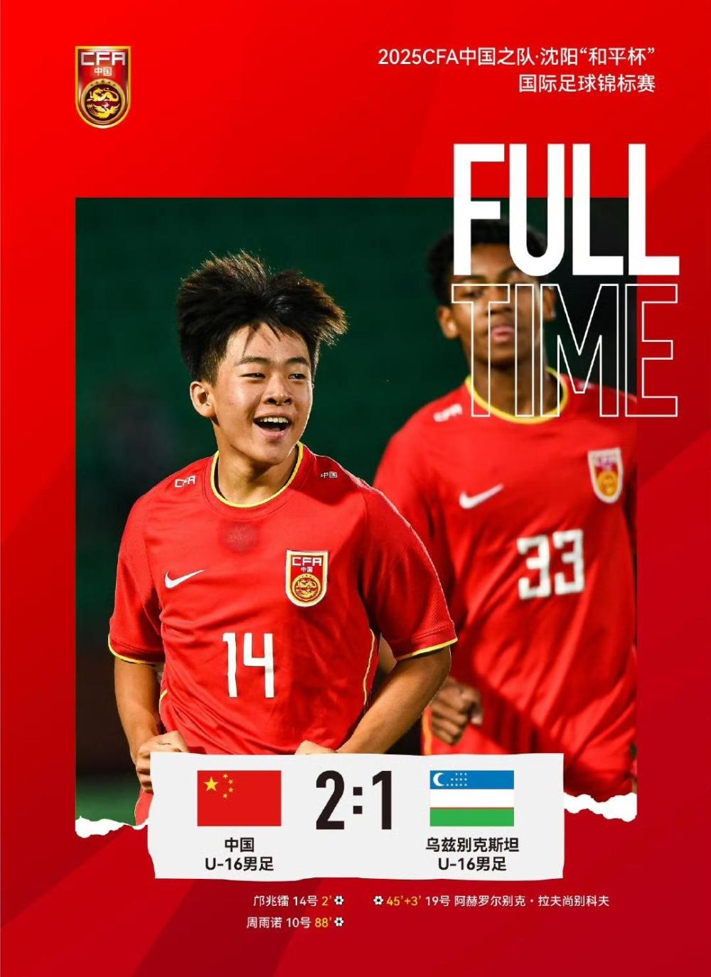 新華社沈陽7月6日電(記者 劉藝淳)6日,2025CFA中國之隊(duì)·沈陽“和平杯”國際足球錦標(biāo)賽次輪在沈陽城市體育場舉行,憑借周雨諾最后時(shí)刻的遠(yuǎn)射破門,中國U16男足完成“準(zhǔn)絕殺”,以2:1力克烏茲別克斯坦隊(duì),保留爭冠希望。