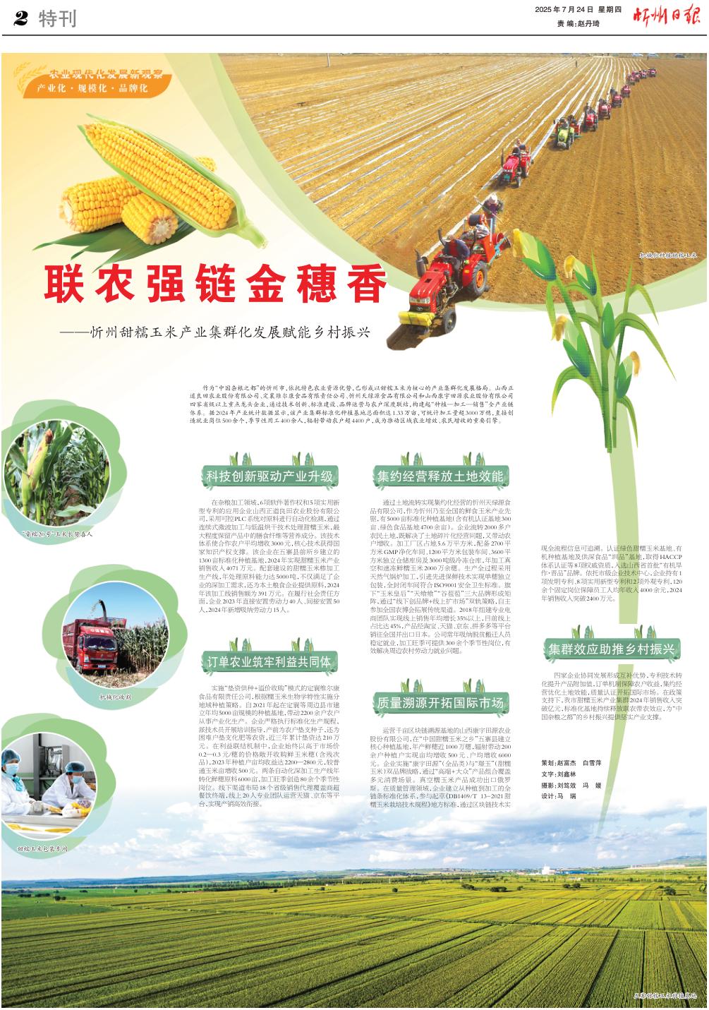 四家企業(yè)協(xié)同發(fā)展形成互補優(yōu)勢,專利技術轉(zhuǎn)化提升產(chǎn)品附加值,訂單機制保障農(nóng)戶收益,集約經(jīng)營優(yōu)化土地效能,質(zhì)量認證開拓國際市場。在政策支持下,我市甜糯玉米產(chǎn)業(yè)集群2024年銷售收入突破億元,標準化基地持續(xù)釋放聯(lián)農(nóng)帶農(nóng)效應,為“中國雜糧之都”的鄉(xiāng)村振興提供堅實產(chǎn)業(yè)支撐。