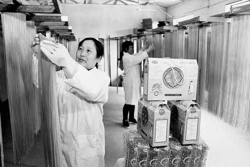 7月20日,工人正在晾曬生產(chǎn)出的“河撈面”。始制于北宋年間的五臺縣民間美食“河撈面”,如今又被該縣豆村鎮(zhèn)列為產(chǎn)業(yè)扶貧項目。在當(dāng)?shù)?,一個由興坪村“霞輝”玉米加工專業(yè)合作社生產(chǎn)出的玉米、高粱、蕎麥、大豆等12類盒裝與袋裝產(chǎn)品,已俏銷太原、忻州等食品市場,年產(chǎn)值達56萬元。(金俊賢 攝)