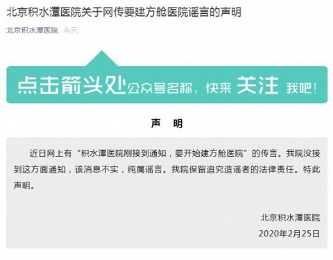 人民網(wǎng)北京2月25日電 據(jù)北京積水潭醫(yī)院官方微信公眾號(hào)消息,針對(duì)近日網(wǎng)上有“北京積水潭醫(yī)院剛接到通知,要開始建方艙醫(yī)院”的傳言,院方回應(yīng),沒(méi)接到這方面通知,該消息不實(shí),純屬謠言。