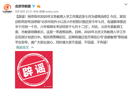 真相:北京市委教育工委、市教委明確表示,這是一條虛假消息。目前,2020年北京義務(wù)教育入學(xué)工作正在按計(jì)劃進(jìn)行中。相關(guān)政策確定后,近期將通過官方微信公號(hào)“首都教育”等權(quán)威平臺(tái)發(fā)布。