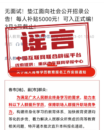 真相:近日,“墊江招聘信息網(wǎng)”微信公眾號(hào)發(fā)布信息:“無(wú)面試!重慶墊江面向社會(huì)公開(kāi)招錄公告!每人補(bǔ)貼5000元!可入正式編!”部分網(wǎng)民看到該信息后誤認(rèn)為,墊江面向社會(huì)以補(bǔ)貼形式招錄具有正式編制的公務(wù)人員,于是紛紛向墊江縣有關(guān)部門(mén)致電咨詢(xún)招錄情況。經(jīng)核實(shí),近年來(lái),墊江未曾以補(bǔ)貼方式和不經(jīng)過(guò)面試招錄具有正式編制公務(wù)人員。該信息實(shí)則為成人學(xué)歷提升培訓(xùn)信息,而非正式編制公務(wù)人員招錄信息。墊江縣互聯(lián)網(wǎng)信息辦公室已依法對(duì)發(fā)布該信息的微信公眾號(hào)負(fù)責(zé)人進(jìn)行約談和教育批評(píng),指出虛假信息的危害性,并責(zé)令刪除相關(guān)信息。(來(lái)源:重慶辟謠)