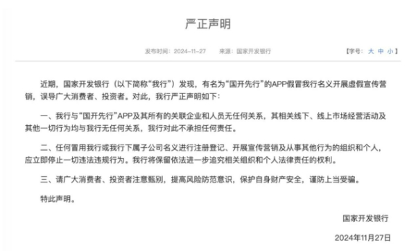 詳情:近期,有名為“國開先行”的APP假冒國家開發(fā)銀行名義開展虛假宣傳營銷,誤導廣大消費者、投資者。對此,國家開發(fā)銀行于11月27日在官網發(fā)布《嚴正聲明》: