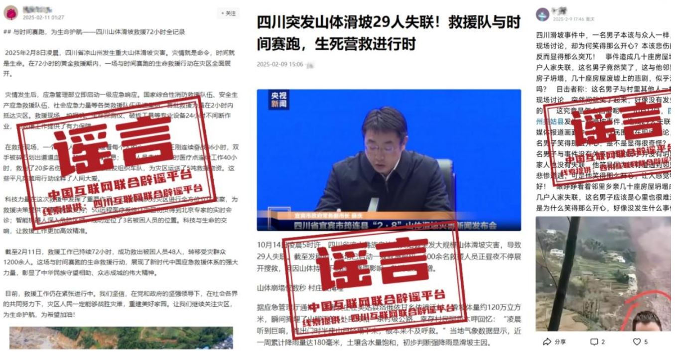 2月9日,有網(wǎng)民在某網(wǎng)絡(luò)平臺(tái)發(fā)布題為《30人被埋!四川山體崩塌瞬間曝光,行車(chē)記錄儀拍下死神奪命10秒》的帖文。經(jīng)核實(shí),帖文配圖均為嫁接舊聞、圖文翻炒,網(wǎng)民將2024年8月茂縣山體滑坡救援現(xiàn)場(chǎng)、2016年12月宜賓市長(zhǎng)寧縣下長(zhǎng)鎮(zhèn)永利村一村民被推土機(jī)掩埋致死事件的舊聞重新拼接合成,編造為宜賓筠連山體滑坡最新動(dòng)態(tài)后發(fā)布。(來(lái)源:四川互聯(lián)網(wǎng)舉報(bào)辟謠平臺(tái)、宜賓網(wǎng)警)