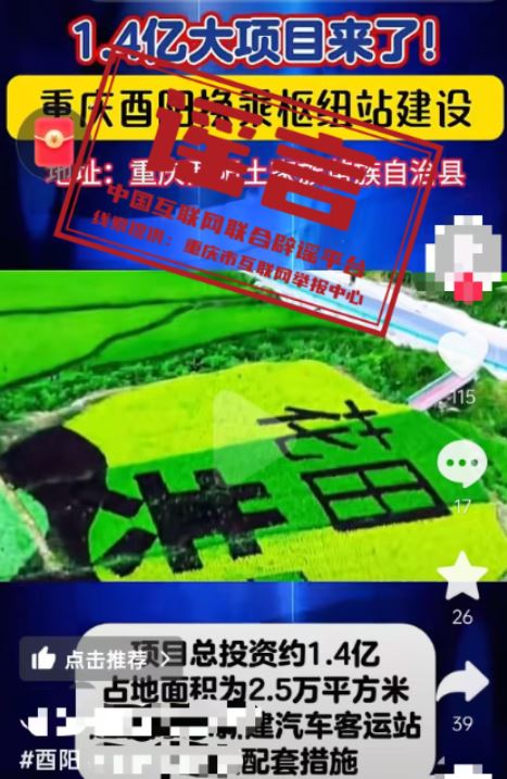 真相:近日,有網(wǎng)民發(fā)布信息稱“1.4億大項目來了,重慶酉陽換乘樞紐站建設(shè),新建汽車客運(yùn)站及相關(guān)配套”,引發(fā)關(guān)注。經(jīng)重慶市酉陽縣交通運(yùn)輸委核實,酉陽縣正在推進(jìn)桃花源景區(qū)游客集散中心提升項目,暫無“1.4億建設(shè)換乘樞紐站”項目,網(wǎng)傳信息系謠言。(來源:“重慶辟謠”微信公眾號)