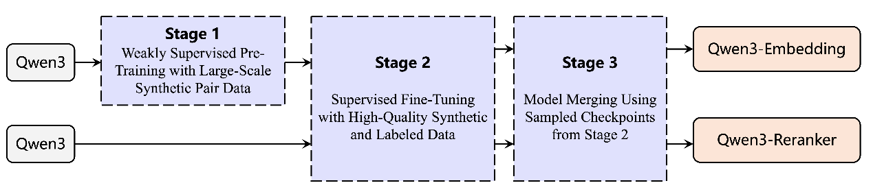 向量模型像是AI的“翻譯器”,它可以將文本、圖片等人類可認知的非結構化信息,映射到機器更易理解的向量空間,再基于這些向量實現(xiàn)高效的信息分類、檢索或排序。也正因此,向量模型對于提升AI的語義理解、信息檢索、多模態(tài)融合等核心能力至關重要?;谇?模型,通義團隊通過對比訓練、SFT、模型融合等方法,打造出全新的千問3向量模型,包含文本嵌入模型 Qwen3-Embedding以及文本排序模型Qwen3-Reranker。