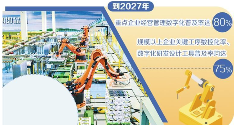 工業(yè)和信息化部等7部門日前印發(fā)《食品工業(yè)數字化轉型實施方案》(以下簡稱《實施方案》)提出,到2027年,重點企業(yè)經營管理數字化普及率達80%,規(guī)模以上企業(yè)關鍵工序數控化率、數字化研發(fā)設計工具普及率均達到75%,打造百個數字化轉型典型應用場景,梯次實施千個數字化示范(試點)項目。