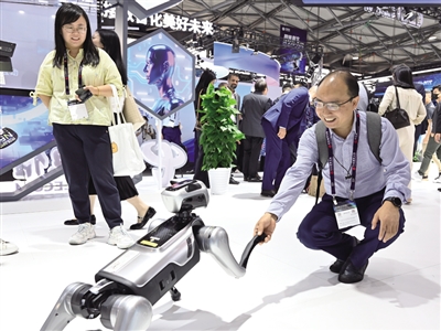 6月18日,觀眾在2025年世界移動(dòng)通信大會(huì)(上海)中國(guó)電信展臺(tái)與智能機(jī)器狗互動(dòng)。 記者 陳愛平 攝
