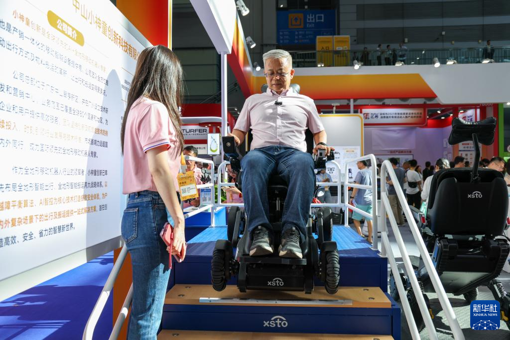 9月12日,觀眾在國(guó)際智慧養(yǎng)老產(chǎn)業(yè)博覽會(huì)現(xiàn)場(chǎng)體驗(yàn)智能出行機(jī)器人。新華社記者 梁旭 攝