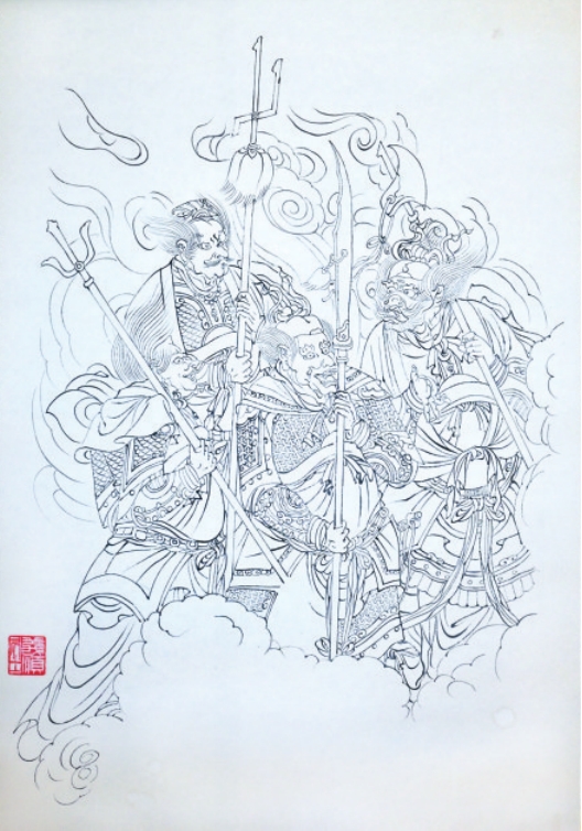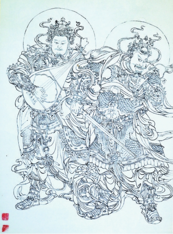 更令李向東醉心不已的是,壁畫中人物衣袖明明是靜態(tài),卻似乎被微風(fēng)吹動、卷起形成鼓動之勢,仿佛下一秒就要隨風(fēng)起舞。在靜止的壁畫中,畫師勾勒出搖動的扇面、飛舞的發(fā)絲,以及在眾仙家之間縹緲虛幻的云海,創(chuàng)造了靈動出畫的動態(tài)美。眾神佛道三五成群,看似錯落隔離,卻又遙相呼應(yīng),彼此相望,顧盼生輝,呼之欲出。在人物群像中,李向東對金剛座神的畫法最為推崇——面目粗獷,體格魁偉,毛發(fā)濃密,一雙銅鈴般的眼睛微微斜視,須眉怒張,威風(fēng)凜凜。身體重心偏向一側(cè),一手持金剛杵于肩頭,一手探掌護于胸前,全身肌肉緊繃,顯示出畫師對線條的熟練運用和高超的造型能力。
