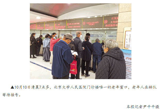 “趕緊地,再晚兩步,號兒就被人用手機搶光了!”10月10日早晨7點,李玉蓉緊捯碎步,催促身后的老伴一起往北京大學人民醫(yī)院門診樓里沖。