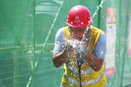 7月11日,入伏第一天。在太原市杏花嶺區(qū)文化活動(dòng)中心項(xiàng)目施工現(xiàn)場(chǎng),工人師傅們?cè)诟邷叵伦鳂I(yè)。圖為一位剛下工的師傅,用涼水沖臉,解暑降溫。山西晚報(bào)記者 武六紅攝
