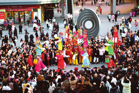 2月11日,孝義市時(shí)代天街人潮涌動(dòng),紅火熱鬧的背鐵棍等傳統(tǒng)民間表演吸引人們駐足觀看。