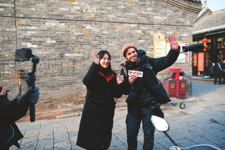 龍祥鳳瑞迎新春、龍躍鳳舞鬧新春、龍章鳳彩賀新春,熱鬧的平遙中國年吸引不少外國友人來打卡,吃美食、看文化、當回“晉商少奶奶”?!捌竭b古城歷史悠久,是曾經(jīng)的‘中國華爾街’,在全世界都非常著名,晉商票號讓人感到震撼?!迸D月廿七中午,剛剛結(jié)束山西大同行程的葡萄牙游客Joao與哥哥來到平遙古城。Joao是一位中國歷史愛好者,談起腳下的平遙古城連連豎起大拇指,“我們特意把平遙的旅程放在春節(jié)這段時間,要轉(zhuǎn)轉(zhuǎn)古城的歷史遺跡,還要看看古城的特色演出,感受一番地道的中國年。”