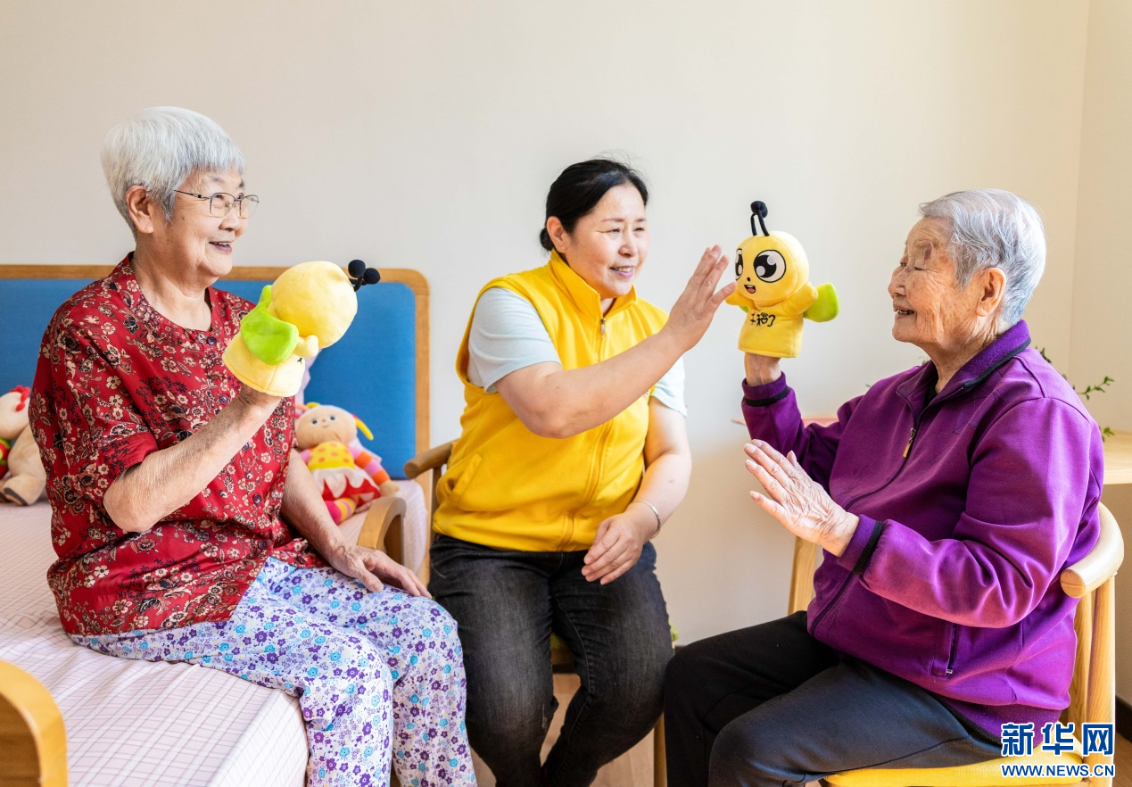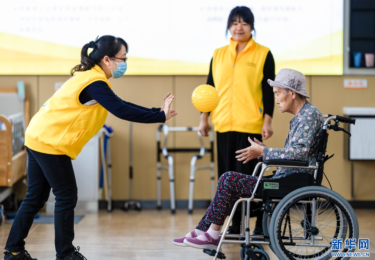 4月8日,工作人員在呼和浩特市玉泉區(qū)居家社區(qū)養(yǎng)老服務(wù)標(biāo)準(zhǔn)化示范中心陪老人做游戲。新華網(wǎng)發(fā)(丁根厚 攝)