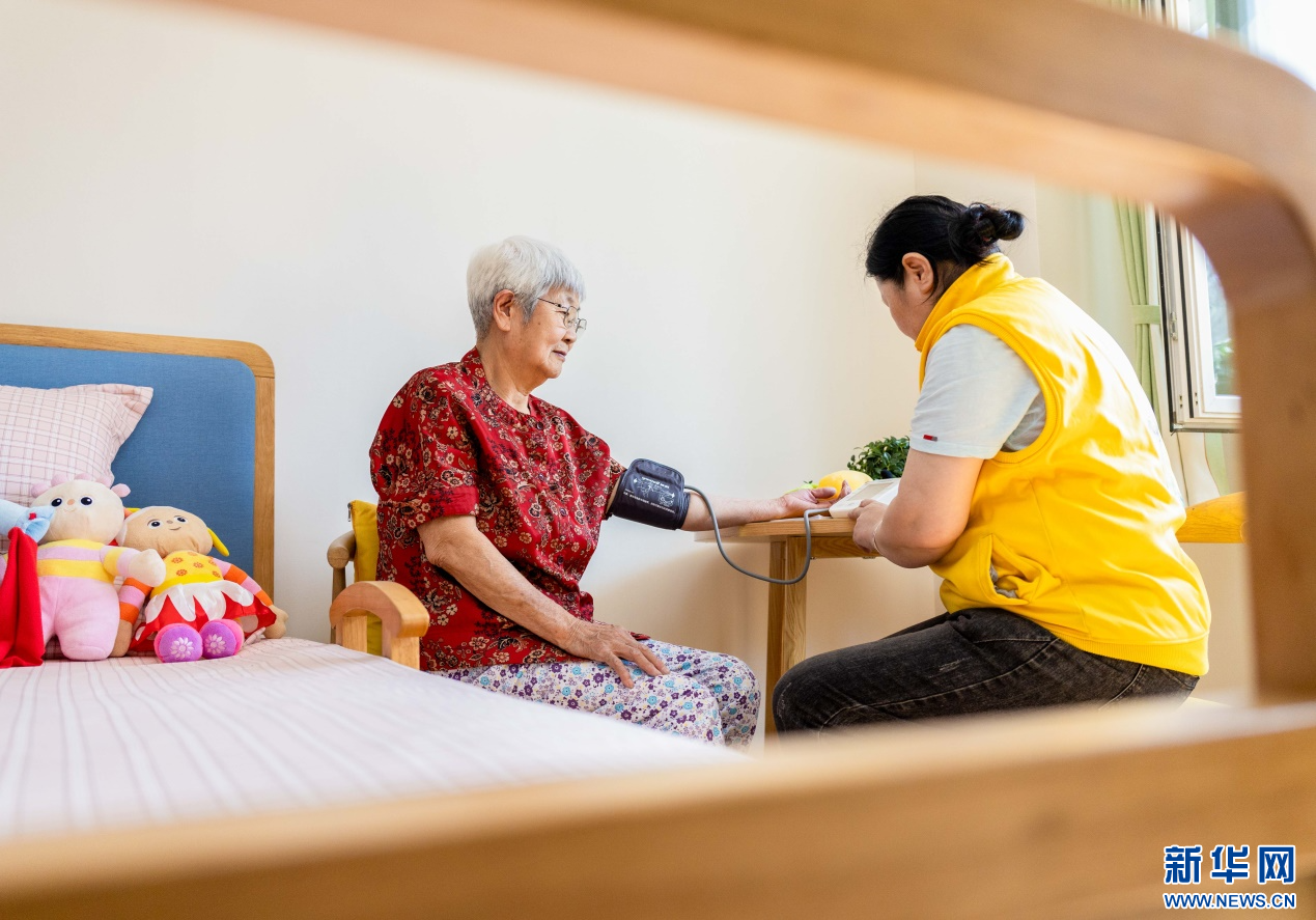 4月8日,工作人員在呼和浩特市玉泉區(qū)居家社區(qū)養(yǎng)老服務(wù)標(biāo)準(zhǔn)化示范中心為老人量血壓。新華網(wǎng)發(fā)(丁根厚 攝)