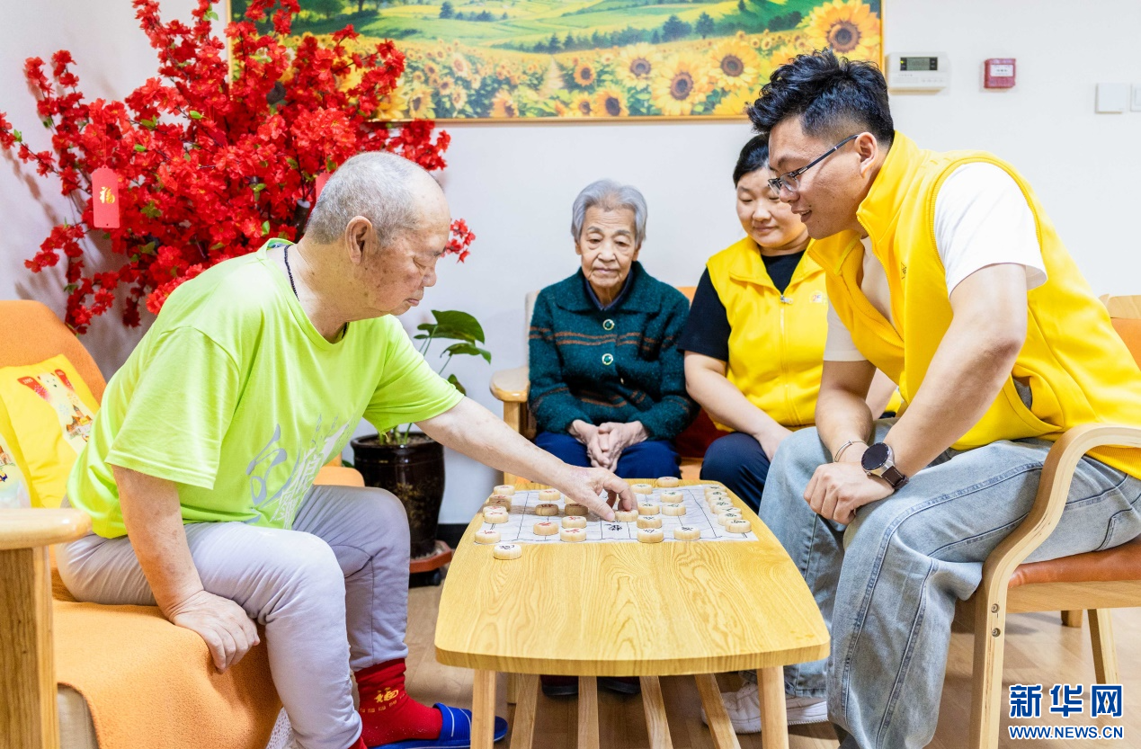 4月8日,工作人員在呼和浩特市玉泉區(qū)居家社區(qū)養(yǎng)老服務(wù)標(biāo)準(zhǔn)化示范中心陪老人下象棋。新華網(wǎng)發(fā)(丁根厚 攝)