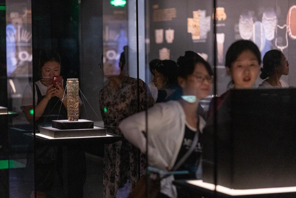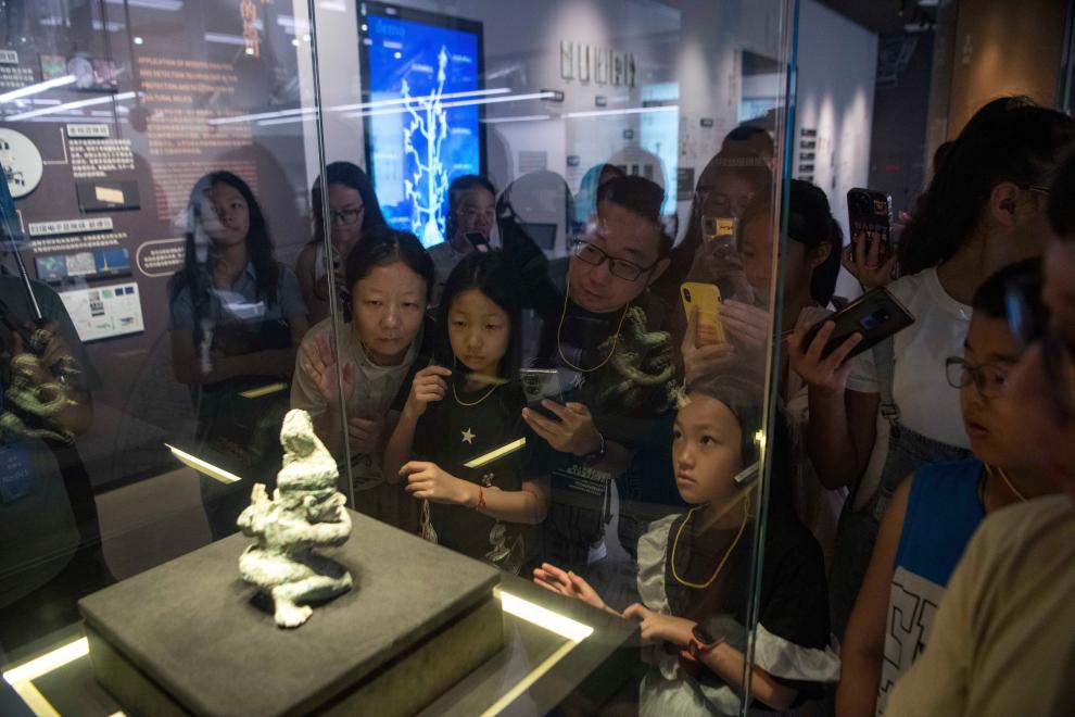 在四川廣漢三星堆博物館文物保護與修復(fù)館,游客在“匠心妙手——三星堆遺址新出土文物保護修復(fù)成果展示”試開放期參觀(7月22日攝)。新華社記者 唐文豪 攝