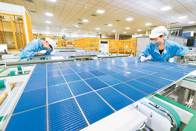 圖為安徽華晟新能源科技股份有限公司的異質(zhì)結(jié)光伏電池及組件工廠內(nèi),技術(shù)人員在對產(chǎn)品進行檢測。徐 勇攝(新華社發(fā))