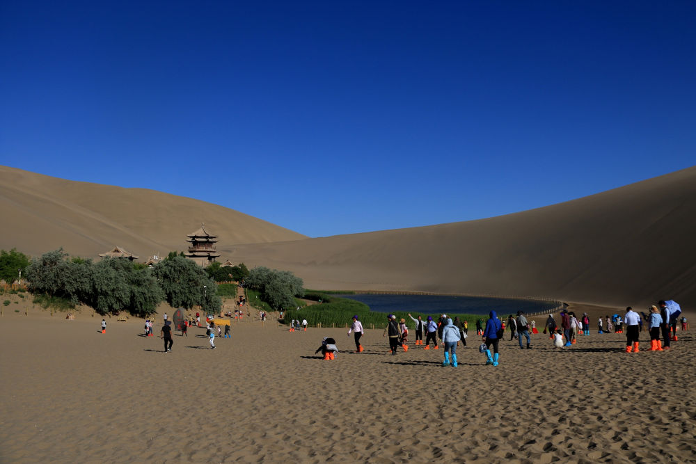 從敦煌市區(qū)出發(fā),向南行走5公里,就到了鳴沙山下。起伏黃沙勾勒出一道道利落的曲線,三面沙山環(huán)抱,突現一泓月牙形狀的清泉,水波蕩漾,魚翔淺底。