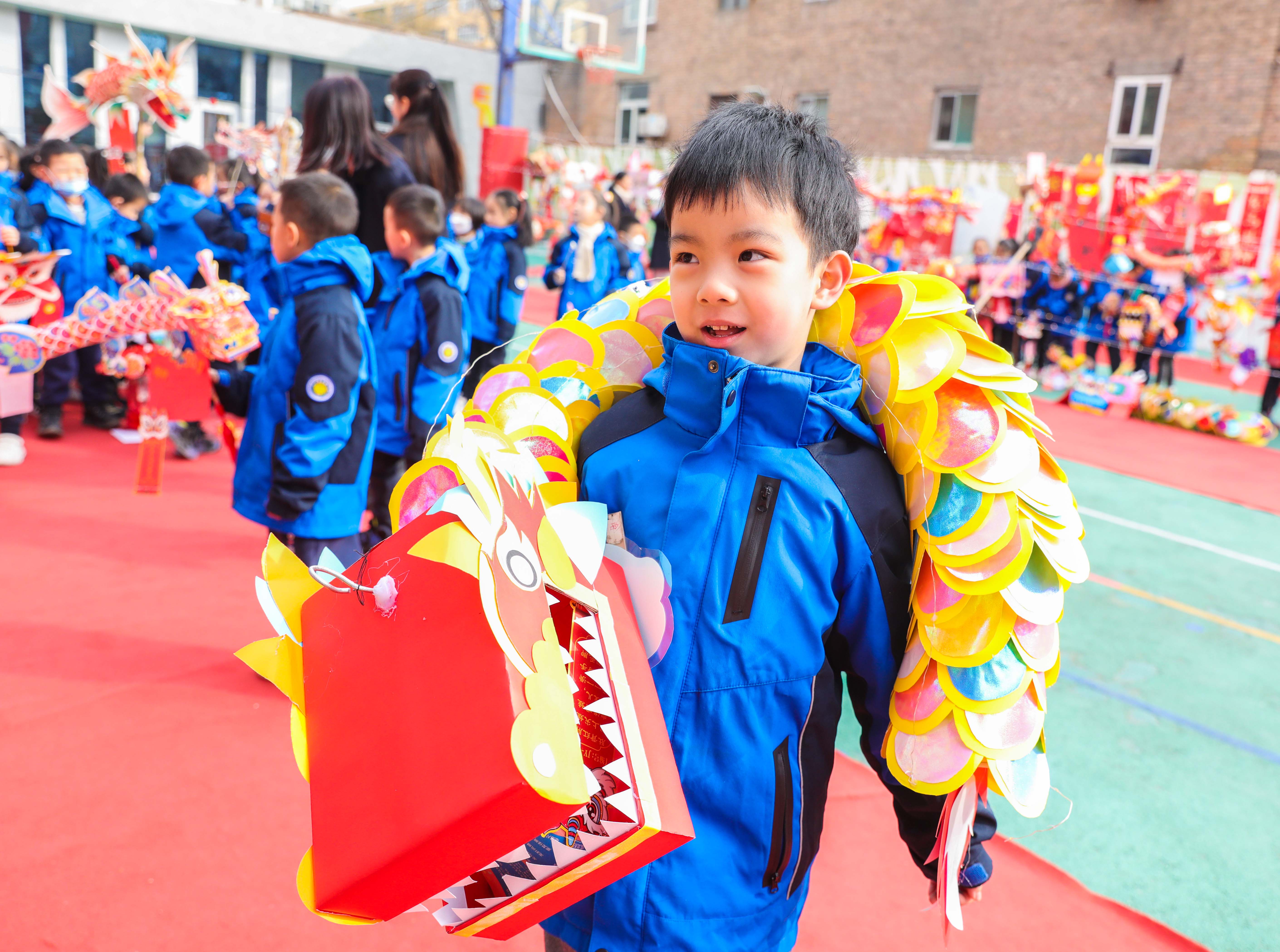 老師們精心布置的國潮風(fēng)操場,無疑是該校開學(xué)首日的一大亮點。操場上鋪著紅地毯,正中央是一長溜兒形態(tài)各異、栩栩如生的龍燈,兩側(cè)是一幅幅紅紅的春聯(lián)和一面面“福”字墻。龍年大吉、魚躍龍門等祝福語隨處可見。滿滿的龍元素,點綴出紅紅火火的新氣象。