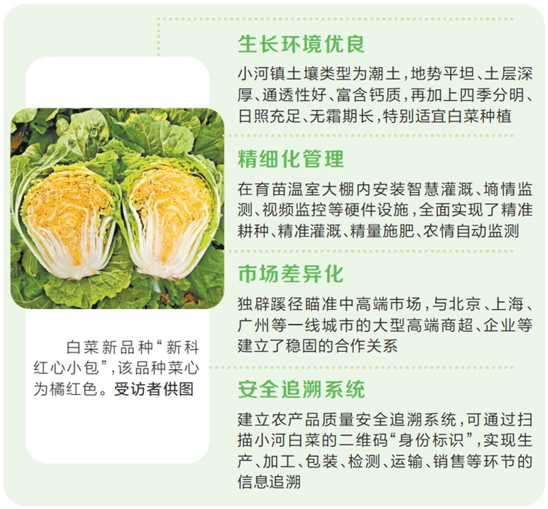 品質(zhì)優(yōu)良的白菜,對(duì)生長(zhǎng)環(huán)境也十分敏感。小河鎮(zhèn)土壤類型為潮土,地勢(shì)平坦、土層深厚、通透性好、富含鈣質(zhì),再加上四季分明、日照充足、無(wú)霜期長(zhǎng),特別適宜白菜種植。2018年,農(nóng)業(yè)農(nóng)村部正式批準(zhǔn)對(duì)“??h小河白菜”實(shí)施農(nóng)產(chǎn)品地理標(biāo)志登記保護(hù),覆蓋小河鎮(zhèn)境內(nèi)崔堡、下灘、張劉莊等47個(gè)行政村,并對(duì)原產(chǎn)地范圍進(jìn)行了明確規(guī)定。