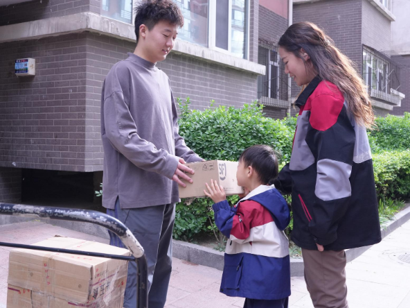 母子倆戴上頭盔,奔赴第一個(gè)派送點(diǎn)。到達(dá)小區(qū)后,面對(duì)要送2件、取1件的任務(wù),辰辰興奮地自告奮勇抱起快遞跑進(jìn)樓道,卻很快被現(xiàn)實(shí)“上了一課”——沒有電梯,收件人住在5層。當(dāng)他送完這家,額頭滿是汗水,步伐也明顯跟不上媽媽了。出了小區(qū),辰辰一句“真累呀,還有那么多,得送到啥時(shí)候啊”,道出了孩子對(duì)媽媽工作艱辛的初步體會(huì)。而閆詩琪輕撫兒子頭說道,“孩子,干啥工作也要有耐心?!辈粌H是對(duì)兒子的鼓勵(lì),更是她日常工作的真實(shí)寫照。