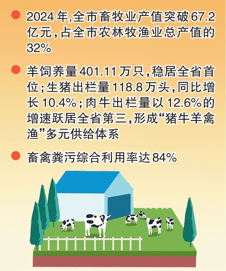 2024年,我市畜牧業(yè)產(chǎn)值突破67.2億元,占全市農(nóng)林牧漁業(yè)總產(chǎn)值的32%;羊飼養(yǎng)量以401.11萬只的規(guī)模穩(wěn)居山西省首位;畜禽糞污綜合利用率達(dá)84%……一組組數(shù)據(jù)背后,正是這座北方畜牧強(qiáng)市以“穩(wěn)產(chǎn)保供”筑牢產(chǎn)業(yè)基底、以“全鏈升級(jí)”助力鄉(xiāng)村振興的生動(dòng)實(shí)踐。