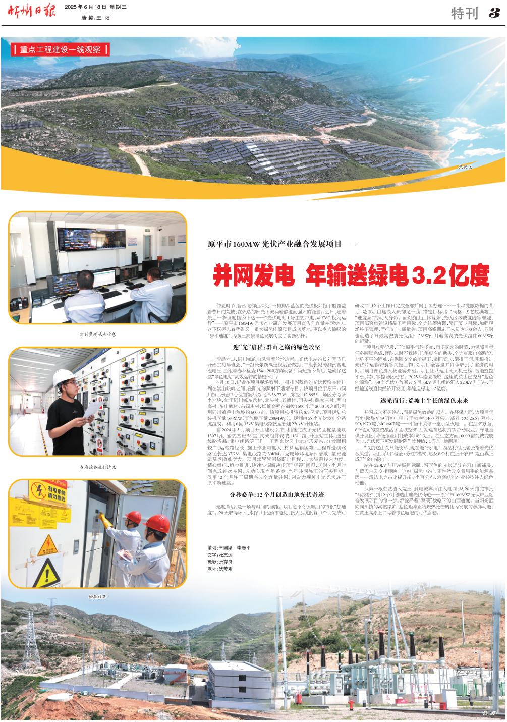 “項目攻堅階段,正值原平氣候多變,雨多霧大的時節(jié),為保障目標任務圓滿完成,團隊以時不我待、只爭朝夕的勁頭,全力克服山高路險、地勢不平的困難,在保障安全的前提下,緊盯節(jié)點,倒排工期,積極推進光伏片運輸安裝等關鍵工作,為項目全容量并網(wǎng)爭取到了寶貴的時間?!表椖坎控撠熑藯顏嗁惤榻B。項目團隊運用無人機巡檢、智能監(jiān)控平臺,實時掌控場區(qū)動態(tài)。2025年盛夏來臨,這里的荒山已變身“藍色能源海”。58個光伏方陣通過6回35kV集電線路匯入220kV升壓站,再經(jīng)輸送線直供經(jīng)濟開發(fā)區(qū),年輸送綠電3.2億度。