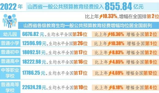 山西日?qǐng)?bào)訊(記者任志霞)日前,教育部、國(guó)家統(tǒng)計(jì)局、財(cái)政部發(fā)布了2022年全國(guó)教育經(jīng)費(fèi)執(zhí)行情況統(tǒng)計(jì)公告(以下簡(jiǎn)稱統(tǒng)計(jì)公告)。統(tǒng)計(jì)公告顯示,2022年山西省一般公共預(yù)算教育經(jīng)費(fèi)投入855.84億元,比上年增長(zhǎng)10.33%,增幅在全國(guó)排第2位。
