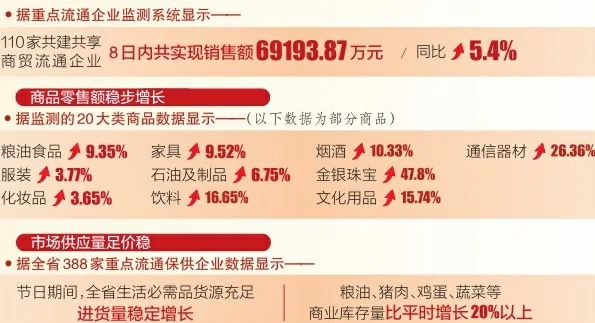 商品零售額穩(wěn)步增長。各市結(jié)合消費(fèi)者追求綠色健康、彰顯個(gè)性多樣、青睞科技智能等方面的消費(fèi)新需求,通過發(fā)放政府電子消費(fèi)券或指導(dǎo)商圈集聚營銷、品牌商品展銷、特色商品促銷等形式,持續(xù)拉動消費(fèi)增長。據(jù)了解,全省各大商場節(jié)日禮盒、時(shí)令水果、糖果糕點(diǎn)、地方土特產(chǎn)、健康保健品、牛奶、飲料、煙酒等銷售旺盛。據(jù)監(jiān)測的20大類商品數(shù)據(jù)顯示,糧油食品、服裝、化妝品、家具、石油及制品同比分別增長9.35%、3.77%、3.65%、9.52%和6.75%;飲料、煙酒、金銀珠寶、文化用品、通信器材等實(shí)現(xiàn)了兩位數(shù)以上的增長,分別為16.65%、10.33%、47.8%、15.74%和26.36%。