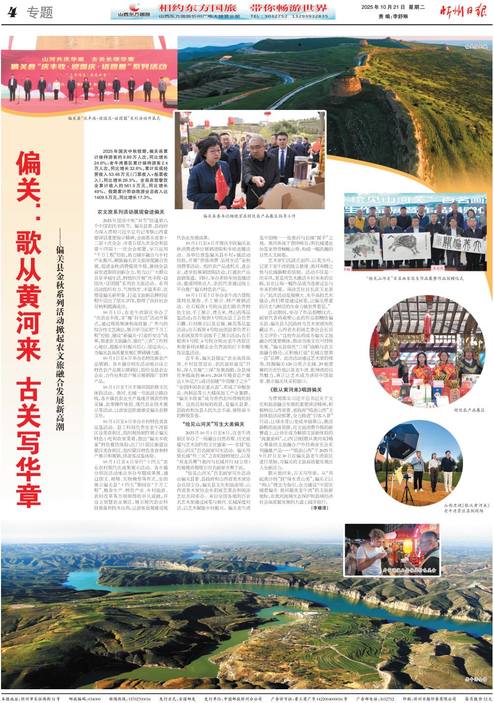 2025年國(guó)慶中秋假期,偏關(guān)縣累計(jì)接待游客約9.89萬(wàn)人次,同比增長(zhǎng)24.6%;老牛灣景區(qū)累計(jì)接待游客2.4萬(wàn)人次,同比增長(zhǎng)32.6%,累計(jì)實(shí)現(xiàn)經(jīng)營(yíng)收入53.46萬(wàn)元(門(mén)票收入+船票收入),同比增長(zhǎng)26.3%。全縣賓館餐飲業(yè)累計(jì)收入約561.5萬(wàn)元,同比增長(zhǎng)49%。假期累計(jì)帶動(dòng)旅游業(yè)總收入達(dá)1409.5萬(wàn)元,同比增長(zhǎng)17.3%。 農(nóng)文旅系列活動(dòng)展現(xiàn)奮進(jìn)偏關(guān) 2025年國(guó)慶中秋“雙節(jié)”恰逢第八個(gè)中國(guó)農(nóng)民豐收節(jié),偏關(guān)縣委、縣政府為深入貫徹習(xí)近平總書(shū)記考察山西重要講話重要指示精神,全面落實(shí)省委十二屆十次全會(huì)、市委五屆九次全會(huì)和縣委十四屆十一次全會(huì)部署,學(xué)習(xí)運(yùn)用“千萬(wàn)工程”經(jīng)驗(yàn),助力城鄉(xiāng)融合與鄉(xiāng)村產(chǎn)業(yè)振興,賦能偏關(guān)農(nóng)文旅深度融合發(fā)展,促進(jìn)金秋消費(fèi)提質(zhì)升級(jí),激揚(yáng)全縣奮發(fā)進(jìn)取的創(chuàng)新合力,努力讓廣大群眾共享幸福生活,特組織開(kāi)展“慶豐收·迎國(guó)慶·話團(tuán)圓”系列農(nóng)文旅活動(dòng)。系列活動(dòng)組織有力、氣勢(shì)恢宏、豐富多彩,在塑造偏關(guān)新形象、打造文旅新品牌的征程中邁出了堅(jiān)實(shí)步伐,取得了良好社會(huì)反響和圓滿成功。 10月1日,在老牛灣景區(qū)舉辦了“慶農(nóng)業(yè)豐收,享‘糜’好生活”活動(dòng)開(kāi)幕式,通過(guò)現(xiàn)場(chǎng)展演和高質(zhì)量、廣參與的綜合性文藝演出,展示學(xué)習(xí)運(yùn)用“千萬(wàn)工程”經(jīng)驗(yàn)、建設(shè)“新偏關(guān)·打造忻安吉”成果,推進(jìn)農(nóng)文旅融合,強(qiáng)化“三農(nóng)”工作核心地位,提振鄉(xiāng)村振興信心、堅(jiān)定決心,為偏關(guān)縣高質(zhì)量發(fā)展匯聚磅礴力量。 10月1日至6日舉辦名特優(yōu)新農(nóng)產(chǎn)品展銷。各鄉(xiāng)鎮(zhèn)分別在活動(dòng)地點(diǎn)設(shè)立特色農(nóng)產(chǎn)品展示展銷區(qū),組織全縣農(nóng)業(yè)企業(yè)、合作社和農(nóng)戶展示展銷推廣農(nóng)特產(chǎn)品。 10月1日至7日開(kāi)展田園農(nóng)耕文化體驗(yàn)活動(dòng)。黃河、長(zhǎng)城一號(hào)旅游公路沿線,各鄉(xiāng)鎮(zhèn)在農(nóng)業(yè)生產(chǎn)基地開(kāi)展農(nóng)作物采摘、農(nóng)事操作體驗(yàn)、現(xiàn)代農(nóng)業(yè)技術(shù)展示等活動(dòng),讓游客近距離感受偏關(guān)農(nóng)耕文化。 10月1日至6日舉辦鄉(xiāng)村特色美食品鑒活動(dòng)??h工科局負(fù)責(zé)在老牛灣景區(qū)設(shè)美食街區(qū),組織現(xiàn)場(chǎng)制作展示偏關(guān)特色小吃和農(nóng)家菜肴,推出“偏關(guān)豐收宴”特色餐飲體驗(yàn);紅門(mén)口景區(qū)廊道設(shè)蒙漢美食街區(qū),組織蒙漢特色美食和特產(chǎn)展示和展銷,供游客品鑒體驗(yàn)。 10月1日至6日舉行“十四五”農(nóng)業(yè)農(nóng)村現(xiàn)代化成果展示活動(dòng)。各鄉(xiāng)鎮(zhèn)分別在活動(dòng)地點(diǎn)舉辦專題成果展,通過(guò)圖文、視頻、實(shí)物模型等形式,全面展示偏關(guān)縣“十四五”期間在“千萬(wàn)工程”、糧食生產(chǎn)、特色產(chǎn)業(yè)、鄉(xiāng)村旅游、農(nóng)村改革等方面取得的非凡成就,并設(shè)立智慧農(nóng)業(yè)展區(qū),展示現(xiàn)代農(nóng)業(yè)科技裝備和技術(shù)應(yīng)用,讓游客直觀感受現(xiàn)代農(nóng)業(yè)發(fā)展成果。 10月1日至6日開(kāi)展慶豐收偏關(guān)金秋消費(fèi)進(jìn)單位展銷團(tuán)購(gòu)和專場(chǎng)直播活動(dòng)。各單位借鑒偏關(guān)縣鄉(xiāng)村e(cuò)鎮(zhèn)活動(dòng)經(jīng)驗(yàn),開(kāi)展“晉情消費(fèi)品質(zhì)生活”金秋消費(fèi)季活動(dòng)。組織農(nóng)產(chǎn)品進(jìn)機(jī)關(guān)、進(jìn)企業(yè)、進(jìn)學(xué)校展銷團(tuán)購(gòu)活動(dòng),打通農(nóng)產(chǎn)品直銷渠道。同時(shí),舉辦多場(chǎng)專場(chǎng)直播活動(dòng),邀請(qǐng)網(wǎng)絡(luò)達(dá)人、農(nóng)民代表通過(guò)線上平臺(tái)推廣偏關(guān)特色農(nóng)產(chǎn)品。 10月1日至7日舉辦老牛灣古堡院落特色展陳、手工展示、特產(chǎn)展銷活動(dòng)。在石板街1號(hào)院由縣婦聯(lián)負(fù)責(zé)特色文創(chuàng)、手工展示、烤玉米、烤山藥等品鑒活動(dòng);在石板街3號(hào)院由縣工會(huì)負(fù)責(zé)石雕、石刻展示以及豆腐、麻花等品鑒活動(dòng);在石板街4號(hào)院由團(tuán)縣委負(fù)責(zé)石頭彩畫(huà)及青年創(chuàng)客手工展示活動(dòng);在石板街5號(hào)院、6號(hào)院分別由老牛灣景區(qū)和榮泰祥冰醋企業(yè)負(fù)責(zé)旅拍打卡和醋飲品鑒活動(dòng)。 近年來(lái),偏關(guān)縣錨定“農(nóng)業(yè)高質(zhì)高效、鄉(xiāng)村宜居宜業(yè)、農(nóng)民富裕富足”目標(biāo),深入實(shí)施“三綠”發(fā)展戰(zhàn)略,全縣綠化率提高到48.6%,2024年糧食總產(chǎn)量達(dá)1.76億斤;成功創(chuàng)建“中國(guó)糜子之鄉(xiāng)”“全國(guó)休閑農(nóng)業(yè)重點(diǎn)縣”,形成了雜糧食品、肉制品等五大精深加工產(chǎn)業(yè)集群,“偏關(guān)豐收宴”成為晉西北叫得響的招牌。這些沉甸甸的收獲