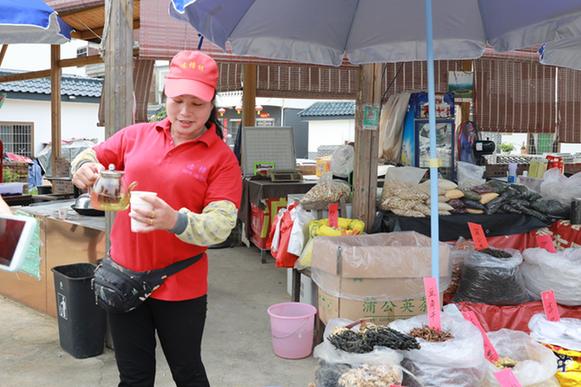 “天太熱,來喝口我這免費的茶。”才入連樟村村口,記者便被熱情的村民陸秀媚招呼到了自己的攤位。紅茶、本地枝葉、山柑皮、筍干……她的攤位琳瑯滿目,擺得滿滿當當。陸秀媚告訴記者,自己曾經(jīng)在市里賣童裝,剛開始還能掙到些錢,后來隨著網(wǎng)購興起,實體店的生意越來越難做。2018年,在習近平總書記來連樟村視察后,看到家鄉(xiāng)越變越好,陸秀媚選擇了回到村里創(chuàng)業(yè)。