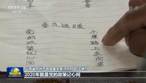 山西省忻州市岢嵐縣宋家溝村村民沈姚付:2019年我寫脫貧不忘共產(chǎn)黨,感恩四方,就是四面八方的游客來吃我的涼粉,也是幫助我脫貧。2020年就是黨的政策記心間,小康路上要永遠(yuǎn)向前,春風(fēng)送暖。