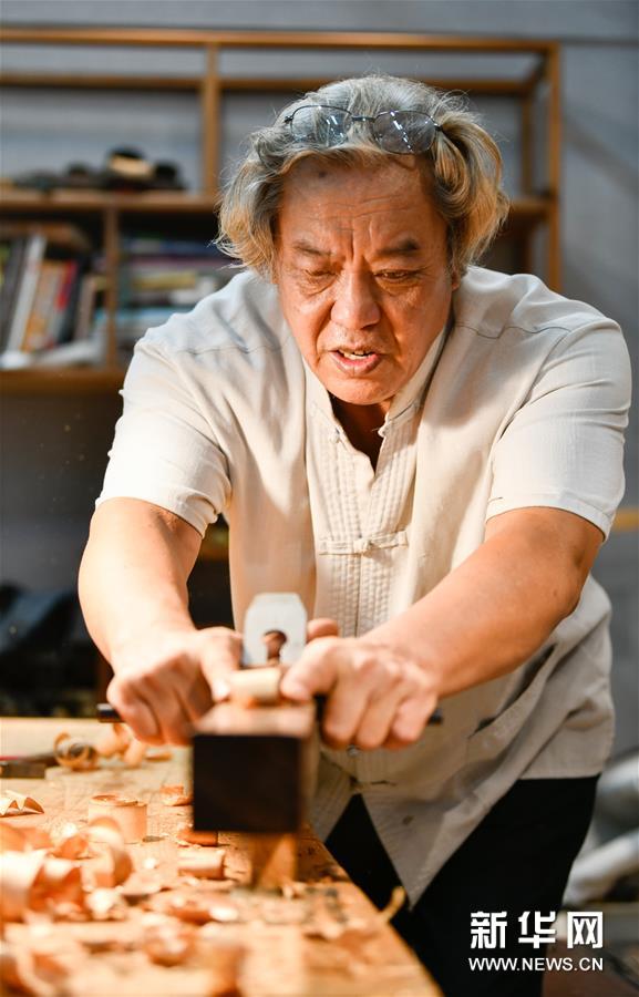 8月25日,在天津職業(yè)大學(xué)辛全生大師木藝工作室,辛全生在用刨刀刮料。今年62歲的辛全生是天津市南開區(qū)傳統(tǒng)木工榫卯技藝的非遺代表性項(xiàng)目傳承人。2019年9月,天津職業(yè)大學(xué)為發(fā)展并傳承木工技藝,邀請(qǐng)辛全生作為老師給學(xué)生們授課,負(fù)責(zé)教授學(xué)生們榫卯結(jié)構(gòu)知識(shí)和木藝家具制作等實(shí)用技巧,并于2019年底在校內(nèi)建立辛全生大師木藝工作室。 辛全生出生于匠人家庭,他聽從父親的建議從16歲開始學(xué)習(xí)木工。40余年的木工生涯,辛全生經(jīng)歷過木工行業(yè)曾經(jīng)的紅火和后來的逐漸衰落,也曾在最艱難的時(shí)候做過別的營(yíng)生。但無論如何,辛全生始終忘不了自己的木工身份?!袄献孀诹粝聛淼臇|西不能丟了,要傳承下去,否則將來的后代誰都不知道木工榫卯技術(shù)的存在了?!毙寥f。 近年來,有近百名不同職業(yè)、不同年齡的人慕名前來拜辛全生為師,學(xué)習(xí)傳統(tǒng)木工榫卯技藝。辛全生說,我會(huì)讓徒弟們學(xué)好木工榫卯技藝,讓中國的傳統(tǒng)手藝發(fā)揚(yáng)光大。新華社發(fā)(孫凡越 攝)