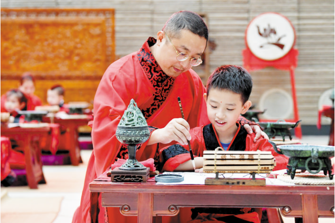 9月13日,一場漢服“開筆禮”在西安大唐西市博物館舉行,多名孩童著漢服,行漢禮,通過“朱砂開智”“啟蒙描紅”等環(huán)節(jié)體驗中國傳統(tǒng)文化。圖為家長帶領孩子一起進行“啟蒙描紅”。 新華社記者 劉瀟 攝