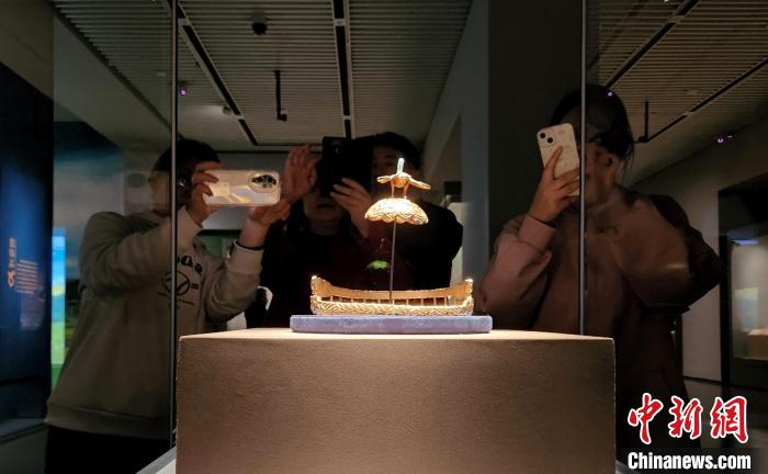 在山東博物館鄂爾多斯青銅文明展現(xiàn)場(chǎng),觀(guān)眾欣賞匈奴鷹頂金冠。趙曉 攝