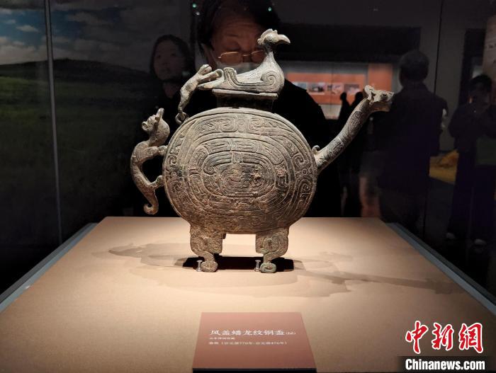 觀(guān)眾在展覽現(xiàn)場(chǎng)欣賞鳳蓋蟠龍紋銅盉。趙曉 攝