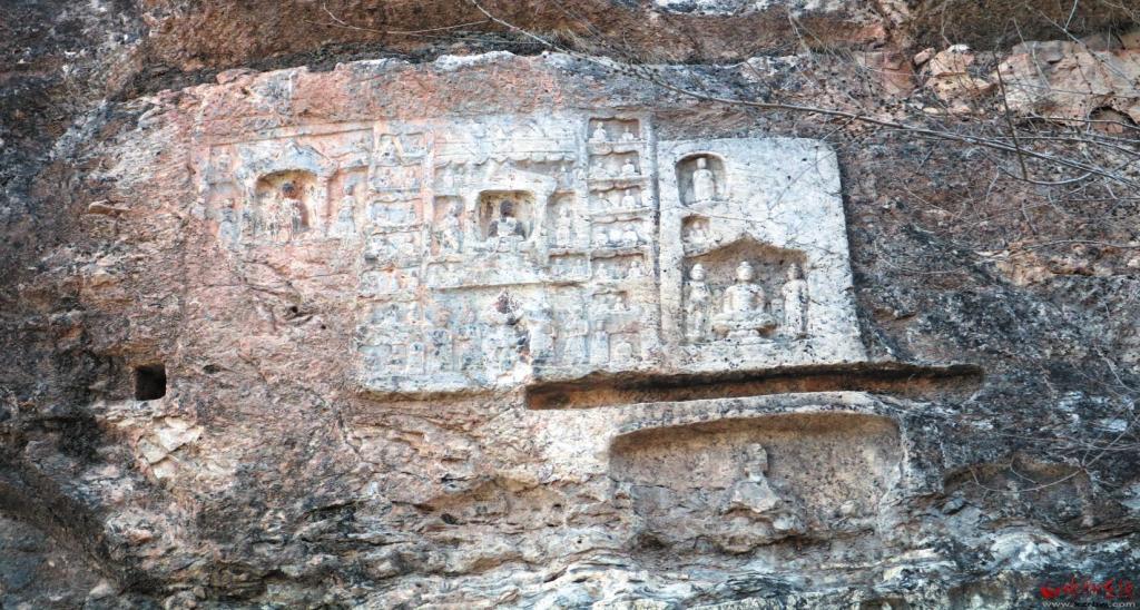七巖山摩崖造像位于定襄縣南王鄉(xiāng)黃場(chǎng)峪村東南約一千米處,分布于溝兩側(cè)崖壁上?,F(xiàn)存東魏、北齊和唐代摩崖造像及石窟共9處,其中石窟5處,摩崖造像4處,大小佛教造像1200余尊,造像總面積約27平方米。據(jù)《定襄金石考》記載:最早的造像及碑記為北魏神龜二年(519),現(xiàn)無(wú)存?,F(xiàn)存最早的摩崖造像及題記為東魏天平三年(536),由僧人慧端等刊刻。另有北齊天保七年(556)廣武令趙郎奴等刊刻的造像及題記,以及唐先天二年(713)造像及題記。石窟主要為佛殿窟和禪窟,造像題材包括七佛、千佛和涅槃像等。