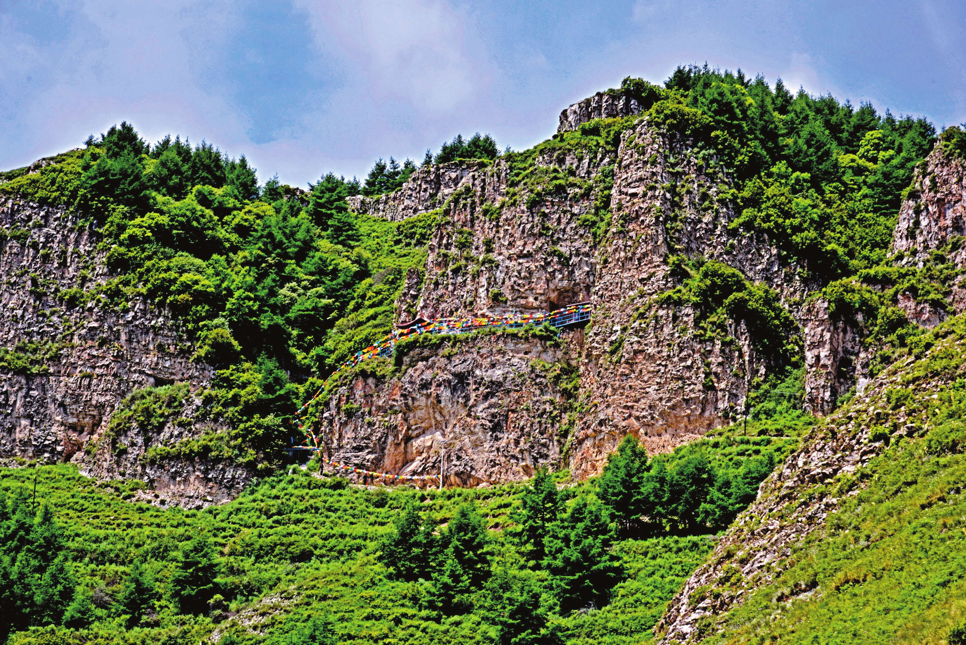 從老君洞主峰下的羊腸小道向前走,可望見峰巒半腰間露出建筑物一角,那便是老君廟了。登臨老君廟,依靠在山的裂縫里開鑿出的一條棧道,一腳一蹬,一步一攀,急不得,快不了,就這樣亦步亦趨才能抵達(dá)這座懸在半空的小廟。