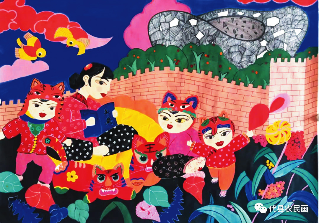 王粉玲《綠色家園》 她們的作品,取材于農(nóng)村、農(nóng)業(yè)、農(nóng)民生活,或表現(xiàn)美好的生活場景,或反映豐收的喜悅,或體現(xiàn)鄉(xiāng)愁,在表現(xiàn)手法上采用大膽的夸張、變形,巧用艷麗的色彩,人物刻畫細(xì)致入微,內(nèi)心喜悅躍然紙上,富有鮮明的地方特色。綜觀她們的作品,無不展現(xiàn)了社會主義新農(nóng)村在新時(shí)代的新變化、新風(fēng)貌,在傳承和弘揚(yáng)代縣文化、引領(lǐng)社會主義精神文明建設(shè)方面做出了出色的嘗試與實(shí)踐。