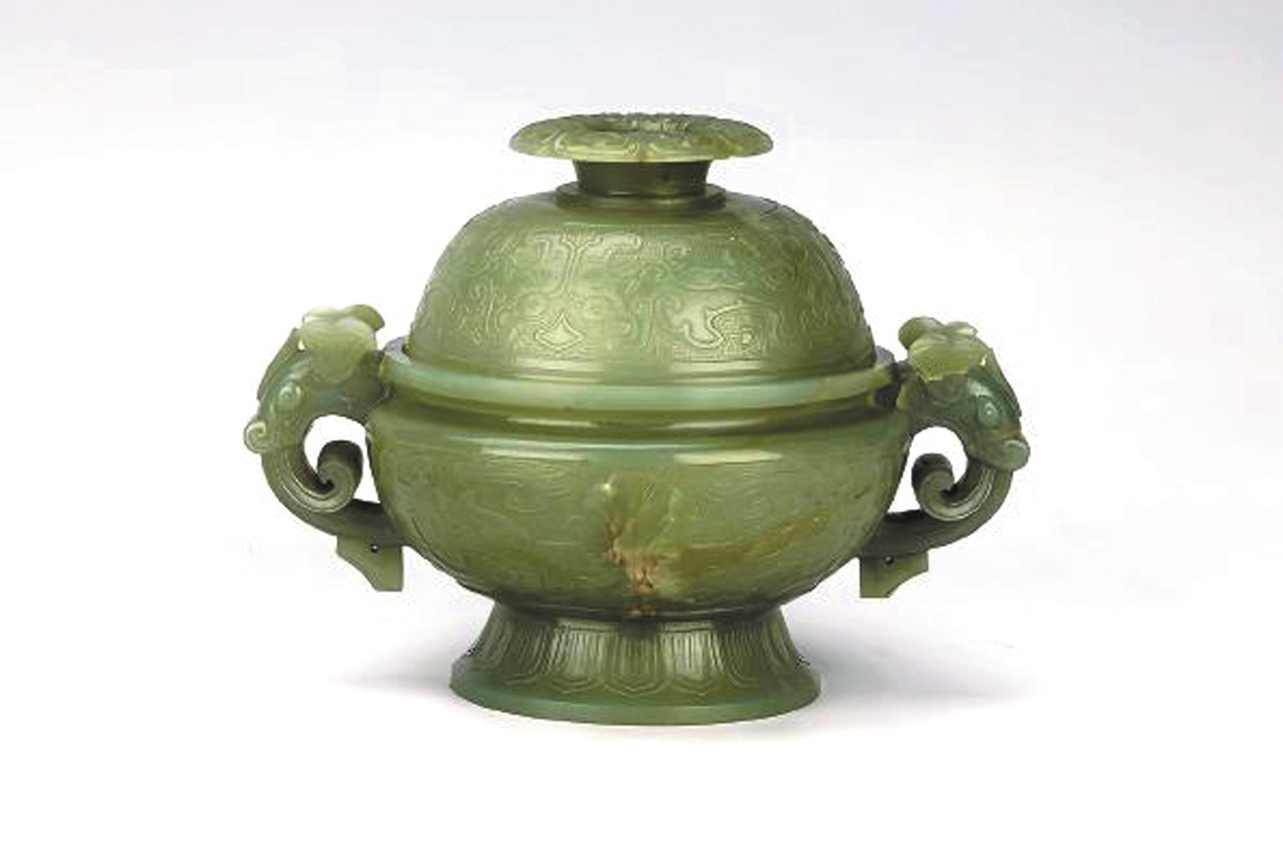 這件清代的獸面紋玉奩,高12.5厘米,口徑11.1厘米,底徑8.2厘米。青玉質(zhì)地,器物以整塊青玉為材料制作,圓形,由上下兩部分組成,高圈足。上面為奩蓋,下面為奩身。奩蓋看上去就像一只倒扣的大碗,釉面光潔,圓潤自然;蓋頂為空心,雕刻仰蓮瓣紋,蓋面雕刻獸面紋,紋飾細(xì)膩生動。奩身與奩蓋相扣合,頸部兩側(cè)相對稱地各鏤雕獸首耳一只,分別與奩腹下相接。腹部滿浮雕獸面紋。圈足外一圈凸雕仰蓮紋,隨器形伸展,充滿動感,讓人心生聯(lián)想:若是將之置于水中,一定頗有幾分清人汪懋麟筆下“玉奩亂潑脂水濃,春波半濺青裙?jié)瘛钡囊馊ぶ?。(李笙清?/p>