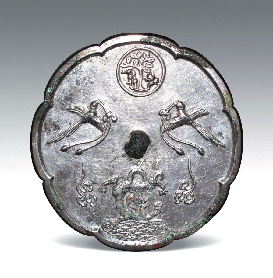 唐代張匯的《千秋鏡賦》云,千秋鏡背“或鑄或镕,是磨是削??桃詾辇垼U以成鵲”,《文苑英華》亦載“鵲飛如向月,龍盤以映池”,與盤龍雙鵲月宮鏡上的紋飾恰好相符。盤龍、雙鵲、祥云,月宮中的玉兔、蟾蜍、桂樹,成為此類銅鏡的畫面主體,引發(fā)人們對月宮的美好想象。