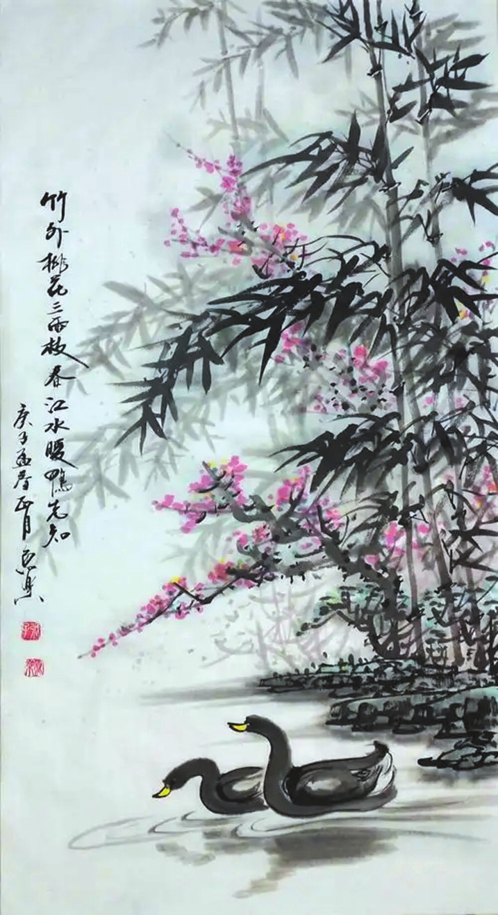 數(shù)字點染,精妙難言。古詩中常用數(shù)字實寫事物,前呼后應(yīng)形成點染。蘇軾《惠崇春江晚景》中寫“竹外桃花三兩枝,春江水暖鴨先知”,先以“三兩枝”具體描寫桃花零星開放的實景,渲染初春的環(huán)境氣氛,再以“春江水暖鴨先知”點明題旨?!叭齼芍Α辈欢嗖簧偾〉胶锰?,點出初春的景物特征——少則春寒料峭,過于冷寂,多則春意盎然,稍嫌熱鬧,都無法與后文“春江水暖鴨先知”對季候變化的感悟相呼應(yīng)。葉紹翁的《游園不值》云“春色滿園關(guān)不住,一枝紅杏出墻來”,先點出“春色滿園”的主旨,再以“一枝紅杏”具體渲染春天壓抑不住的蓬勃生機,以及作者游園不成忽見“春色”破墻溢出的驚喜。這個“一”是其余數(shù)字替代不了的,數(shù)字點染,準確精當,妙不可言。