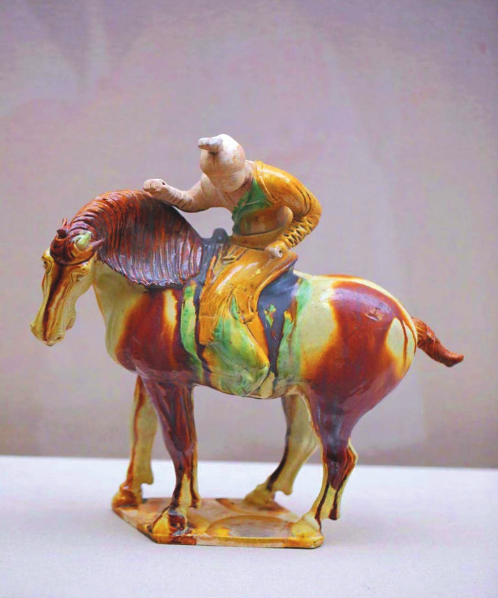 唐代女子也熱愛(ài)打馬球,《明皇擊球圖》展現(xiàn)了唐玄宗與后宮妃嬪打馬球的場(chǎng)景,河南洛陽(yáng)唐代王雄誕夫人魏氏墓曾出土四件三彩打馬球女俑。唐代詩(shī)文中也有女子打球的記載,王建《送裴相公上太原》中寫“千群白刃兵迎節(jié),十對(duì)紅妝妓打球”,張籍的《寒食內(nèi)宴二首》亦云“廊下御廚分冷食,殿前香騎逐飛球”的詩(shī)句。由于馬球運(yùn)動(dòng)的流行,唐代有很多與馬球相關(guān)的文物,流傳至今的馬球、球桿、球場(chǎng)碑石、繪畫、泥塑等數(shù)不勝數(shù)。