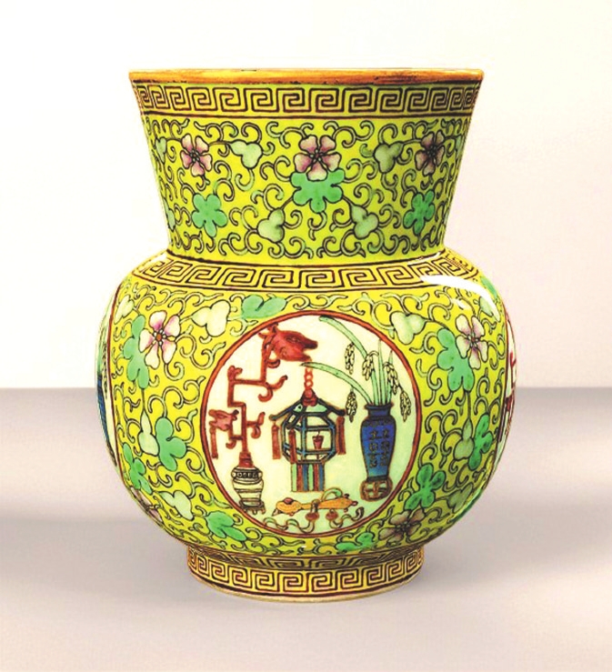 故宮博物院收藏的清代粉彩葫蘆萬代五谷豐登紋渣斗,內(nèi)壁繪粉彩纏枝葫蘆紋,藤蔓相連,花果繁茂,寓意“子孫綿延”“多子多福”;外壁黃地亦繪相同葫蘆紋,設(shè)四處圓形開光,內(nèi)有宮燈、花瓶、如意、稻穗等,寓意“平安如意”“五谷豐登”。開光內(nèi)花瓶飾“囍”字,表明為皇帝大婚用瓷,既祈子嗣繁衍,又添喜慶吉祥。整器色彩明艷,紋飾繁密華麗,盡顯清代晚期宮廷裝飾的典型風(fēng)格。