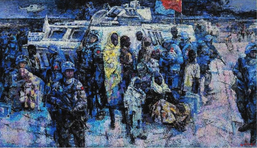 在續(xù)鶴賢眾多的作品中,從畫面表現(xiàn)效果方面,我是比較喜歡《和平使命——藍色交響曲》這幅作品的。無論畫面構圖、色彩關系,還是人物造型以及表現(xiàn)技巧,都堪稱完美。畫面中無論人物形象、動態(tài)、表情,還是人與自然背景,都處在一種和諧美好的關系中,從一個新的角度給予美好詮釋。這幅作品表現(xiàn)的是我們的維和部隊“子弟兵”以自己的生命守護著世界和平,講述著構建人類命運共同體的大國情懷。 (邢晨聲 文)